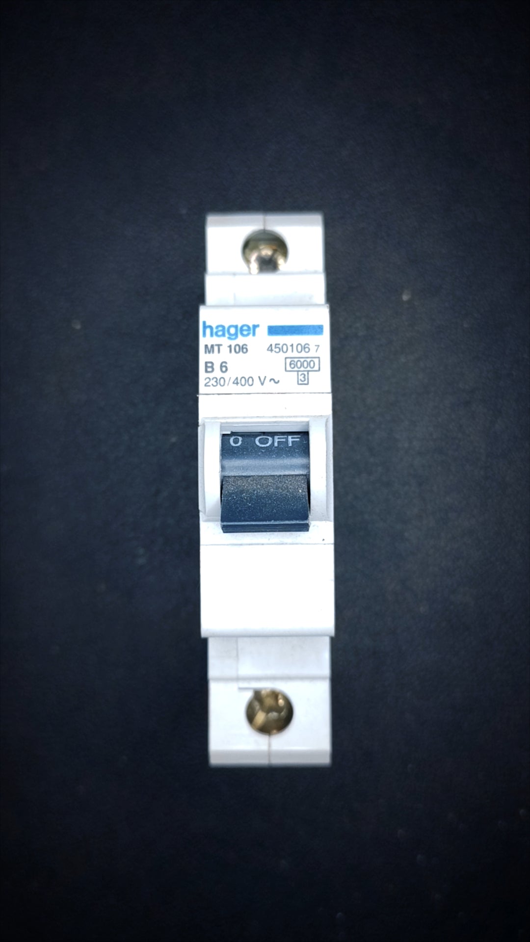 The Hager MT 106 is a single pole circuit breaker with a current rating of 6A and a short circuit breaking capacity of 6000A. It is designed for use in electrical circuits to protect against overloads and short circuits. The product is identified by the SKU Hager-MT106.